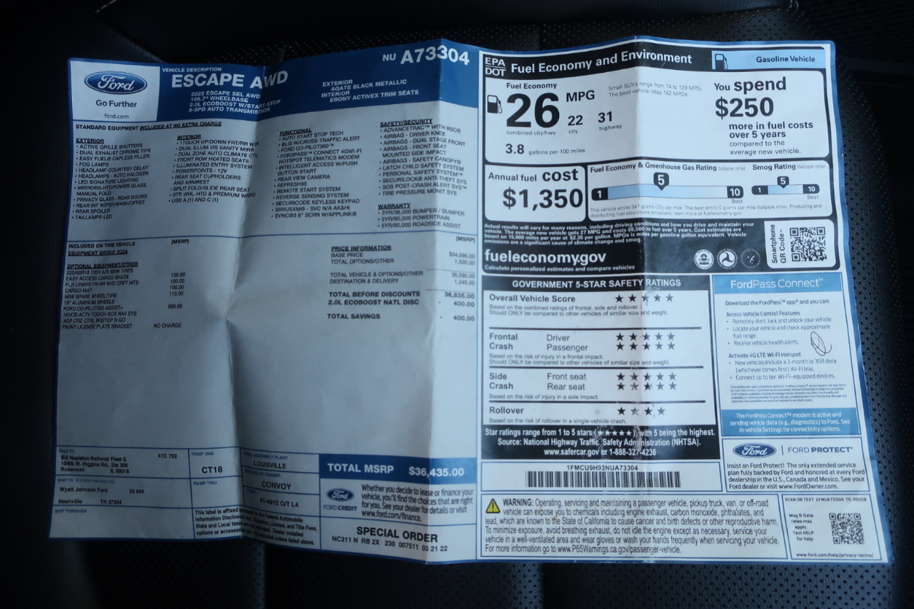 Local One Owner - 2022 Ford Escape SEL AWD - This one is ready for winter with all wheel drive, all season floor and cargo mats, heated seats, heated steering wheel and remote start. The Activex seat upholstery looks like leather and is super durable. Other features include power tailgate, BLIS with Cross Traffic Alert, Rear parking sensors to go along with the backup camera, Navigation, LED signature lighting and LED taillamps, Rear privacy glass, Apple CarPlay and Android Auto, 4G LTE Wi-Fi Hotspot, 8'' color touchscreen, 18'' aluminum wheels and most importantly optional Ford Co-Pilot360 Assist that adds automatic emergency braking, lane keeping system, automatic high beams, intersection assist that watches for oncoming traffic and pedestrians when turning, evasive turning assist, intelligent adaptive cruise control and speed sign recognition. This Escape is in excellent shape and it drives great. We do not charge dealers fees so only additions to price are tax and tag. Trades are welcome. We are family owned and have been at our Berry Hill location for 25 years, south of Downtown Nashville and a few minutes from 100 Oaks Mall. (615) 460-7600 Office, (615) 456-8700 Paul, (615) 476-0572 Peter Auto Brokers 636 West Iris Dr Nashville TN 37204